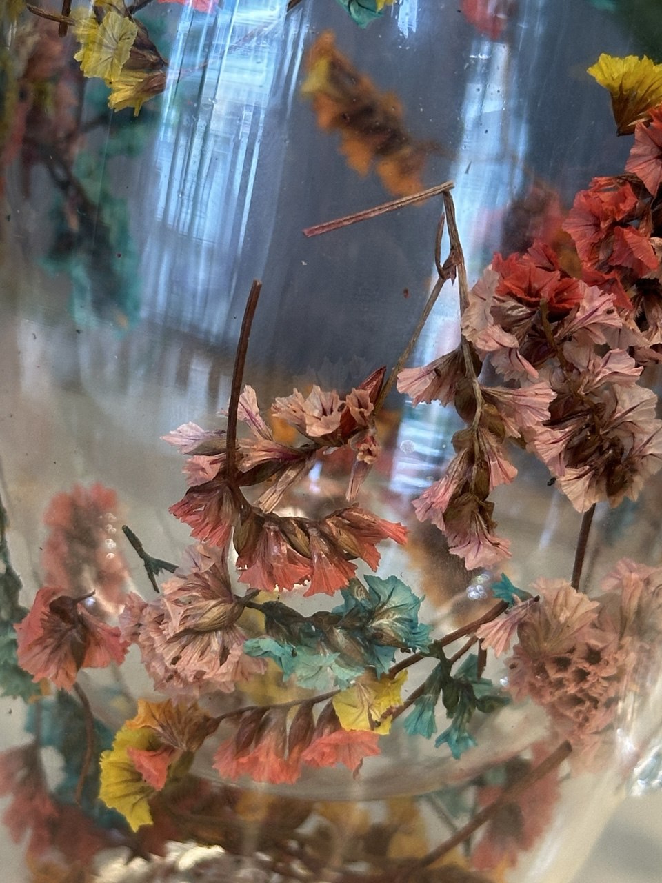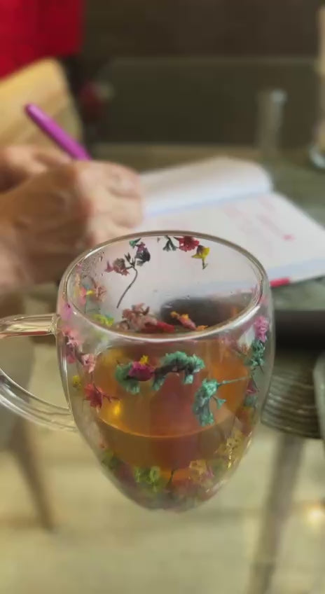 Taza de vidrio transparente con flores coloridas en el centro, perfecta para disfrutar de nuestros tés.